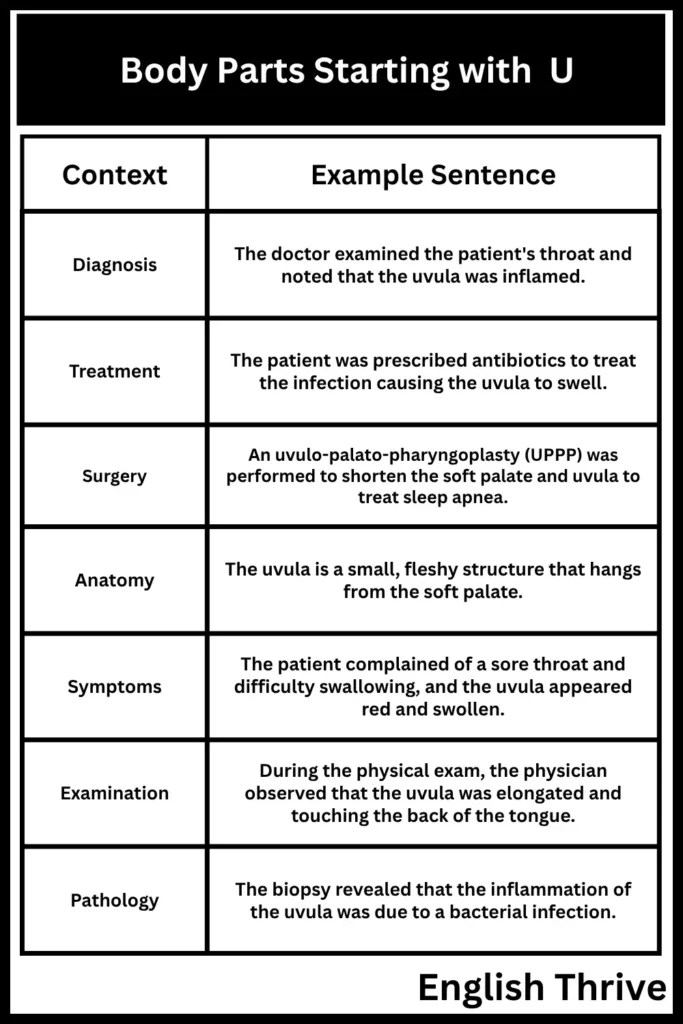 Since the primary body part starting with “U” is the uvula, the examples will focus on its role in various contexts.