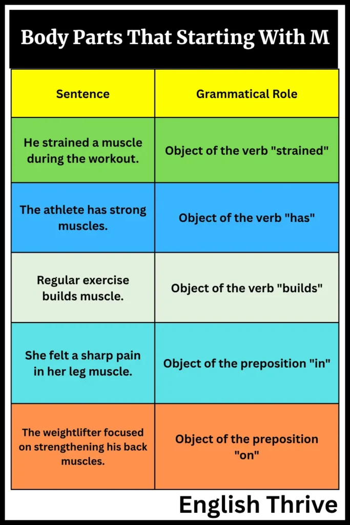 When using body parts starting with ‘M’ in sentences, it’s important to understand their structural role. As nouns, they can be modified by adjectives, used with articles (a, an, the), and participate in various grammatical constructions.