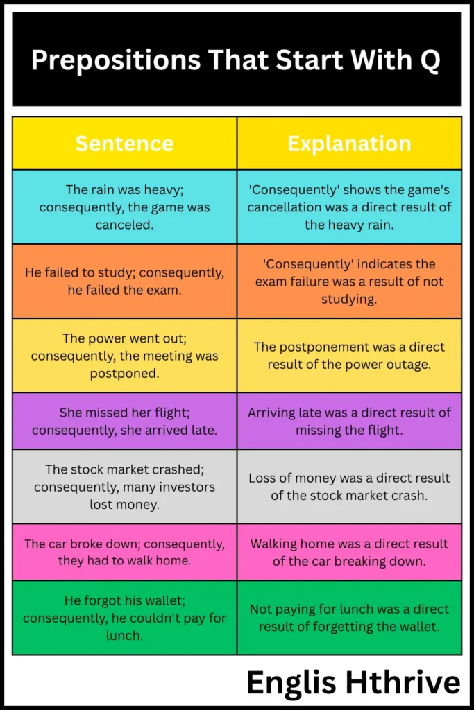 | The rain was heavy; consequently, the game was canceled. | ‘Consequently’ shows the game’s cancellation was a direct result of the heavy rain. |