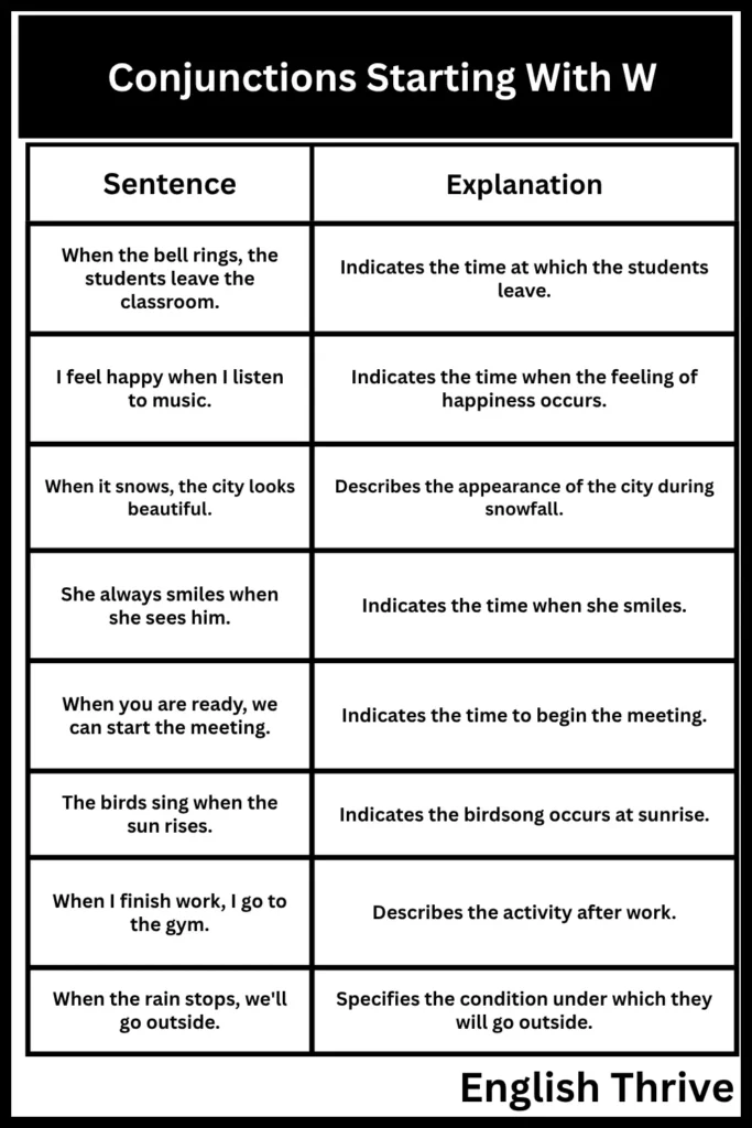 The following table provides examples of sentences using the conjunction “when” to denote time.