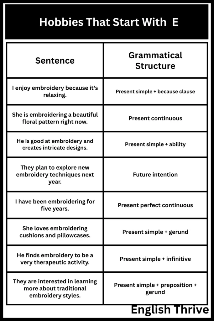 Here are several examples of how to describe hobbies starting with ‘E’ using different grammatical structures. The following tables provide a range of sentences showcasing various tenses and verb patterns.