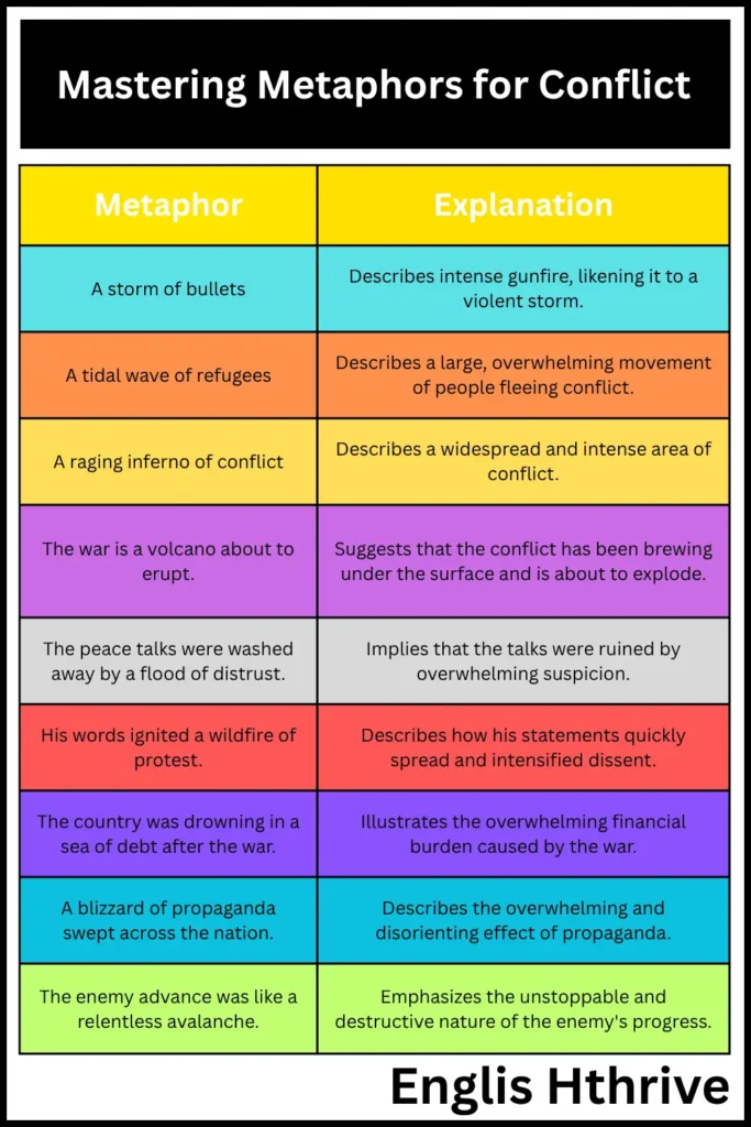Examples include: “a storm of bullets,” “a tidal wave of refugees,” and “a raging inferno of conflict.” These metaphors invoke images of overwhelming force and devastation.