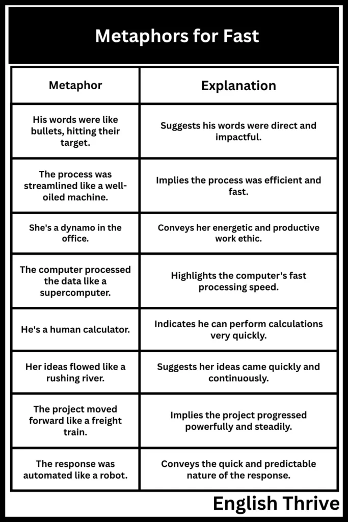 By employing metaphors for “fast,” we can convey not just the speed itself, but also the intensity, energy, and impact of that speed.