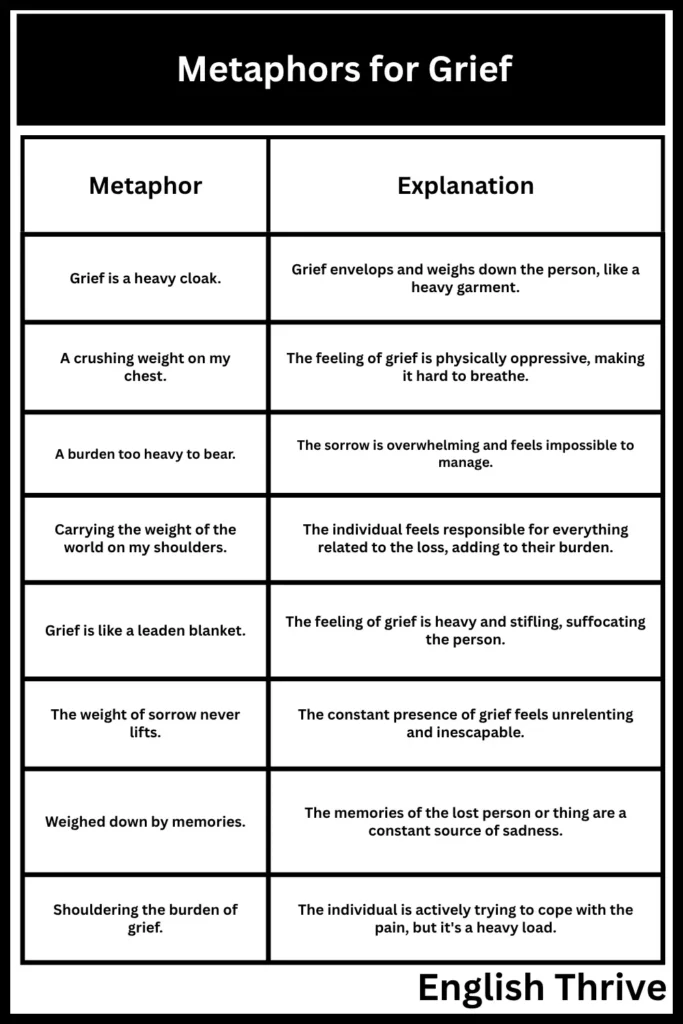 These metaphors portray grief as a heavy load that one must carry. They emphasize the emotional and mental strain that grief places on an individual.