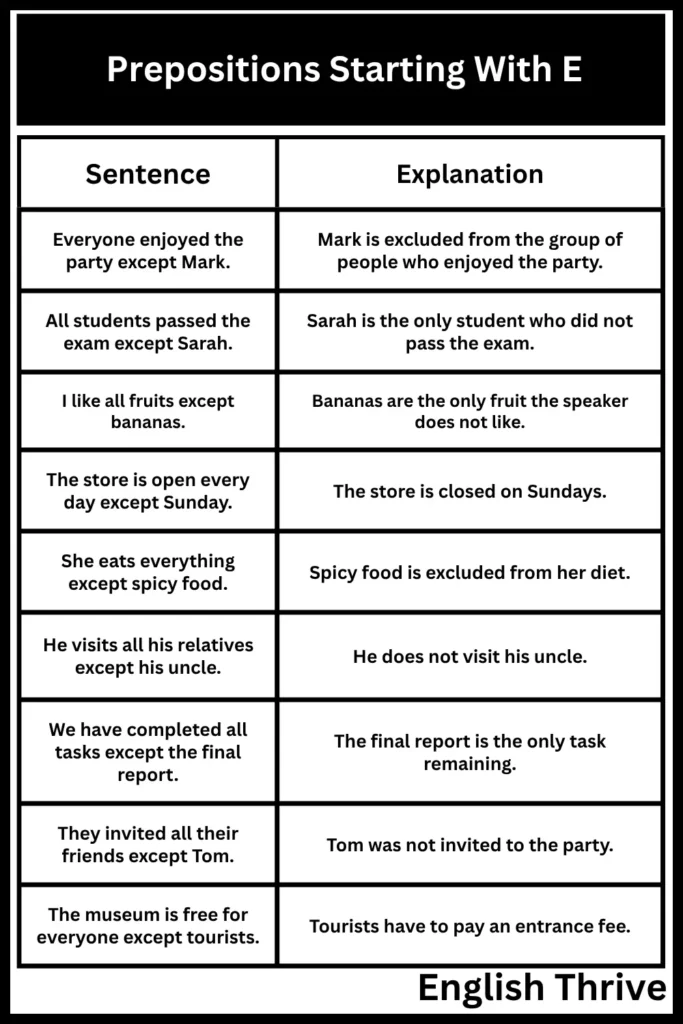 To fully understand how to use prepositions starting with ‘E,’ it’s helpful to examine numerous examples in various contexts. Below are several tables illustrating the usage of ‘except’ and ‘except for’ in different sentences.