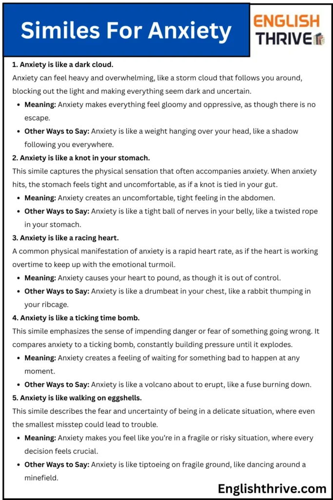 Similes for anxiety are more than just literary tools—they are practical ways to communicate, understand, and cope with anxiety. By using familiar comparisons, you can gain insight into your emotions and find ways to address them. These comparisons allow you to take control of an overwhelming emotion, making it easier to express and deal with. Whether you’re using similes for anxiety for self-awareness, talking to others, or seeking professional support, they are a helpful bridge to understanding the complexities of anxiety.