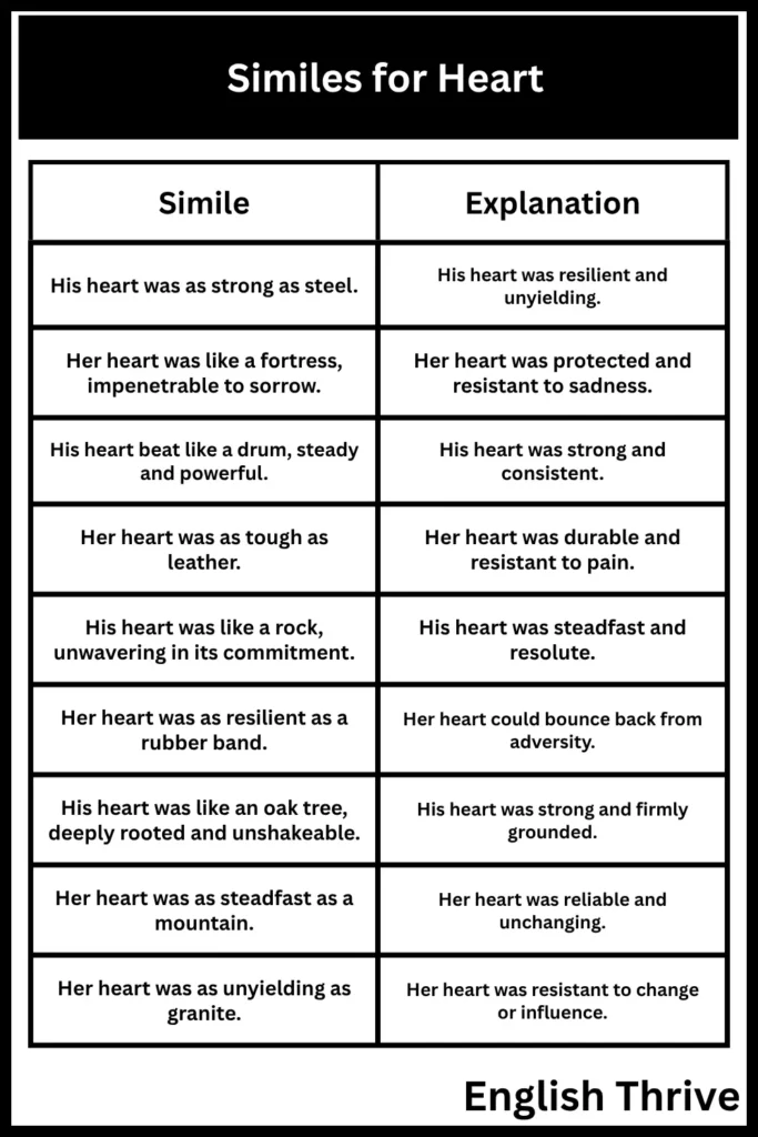 Whether you’re describing the strength, fragility, warmth, or coldness of the heart, similes offer a powerful way to convey its multifaceted nature. Remember to use them judiciously, ensuring clarity, relevance, and originality in your comparisons.