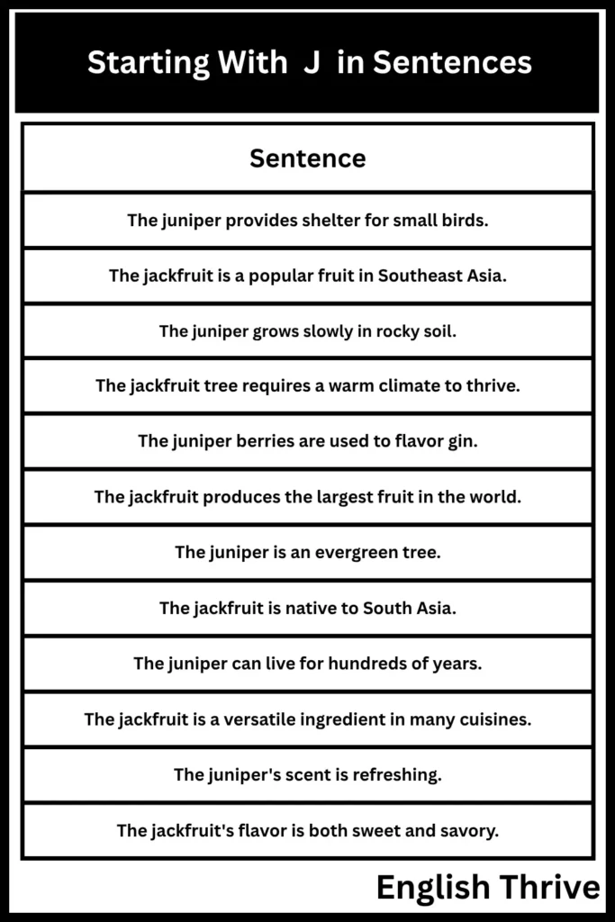 The following table provides examples of trees starting with the letter ‘J’ used as the subject of a sentence. Each example highlights the tree name in bold and demonstrates its role in initiating the action or being described by the verb.