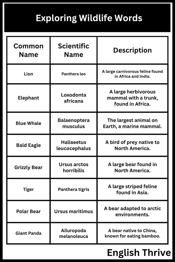 The following tables provide examples of wildlife words, categorized by type. Each table includes a variety of examples to illustrate the breadth and diversity of wildlife terminology.